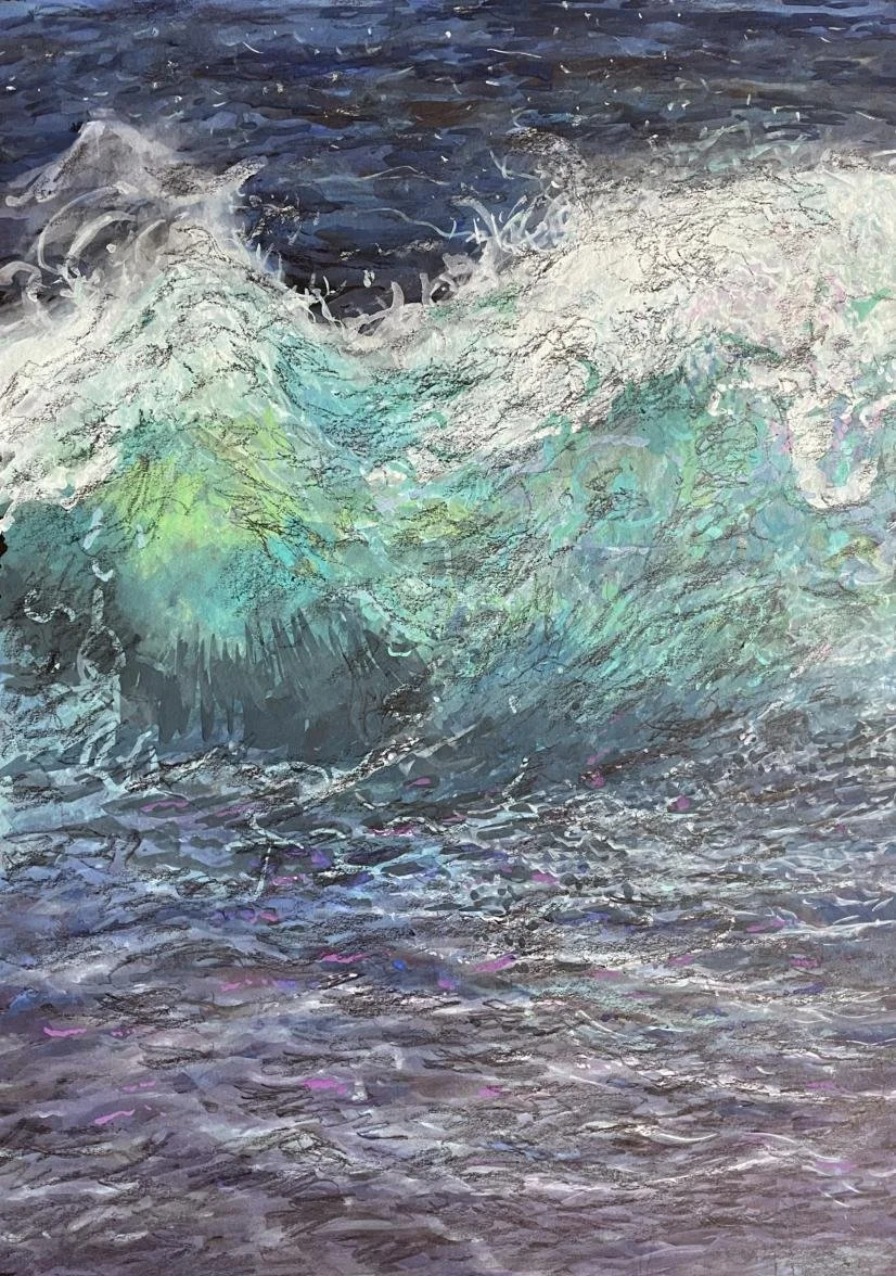 my first real take on 'wave art', from the imagination and a little reference, somehow you know it's going to be good, first pass, gouache and a 2B pencil on black paper, ongoing - August 2025